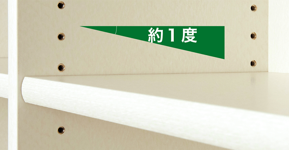 可動棚は後方に向かって約1度の勾配をつけています。収納物が手前に落下しにくいようになっています。