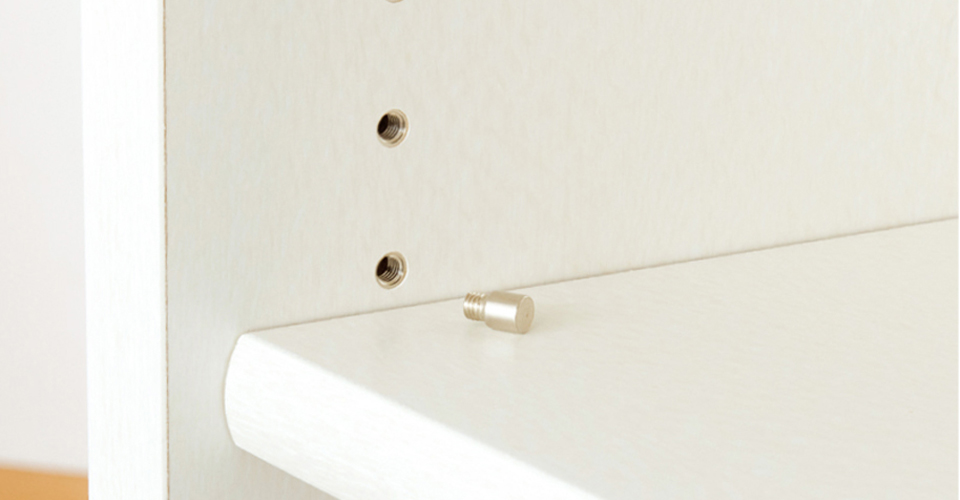 棚受けにはネジ式の金ダボを使用しているため、抜け落ちにくく安心です。オプション引き出し(別売り)も、しっかりと支えます。