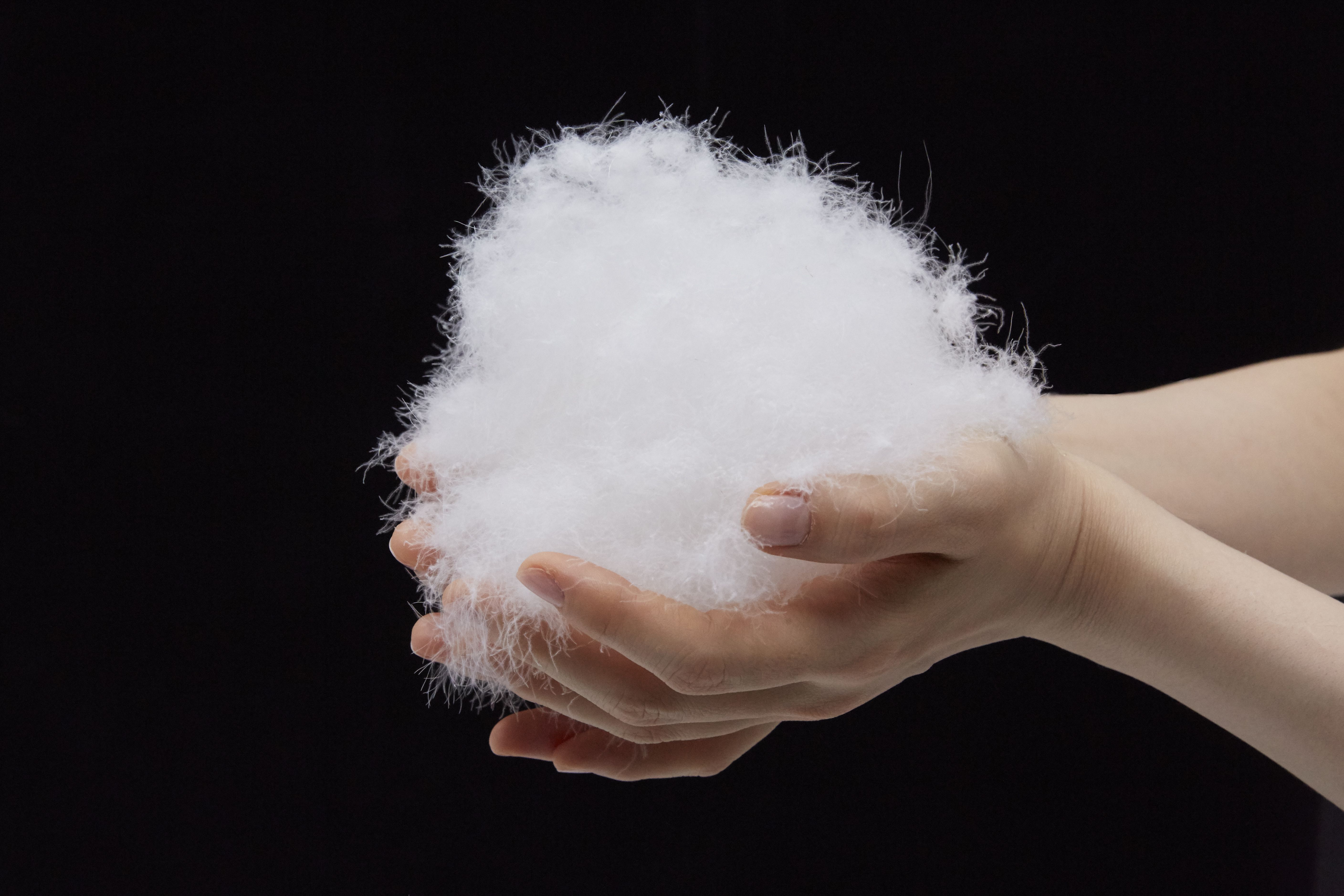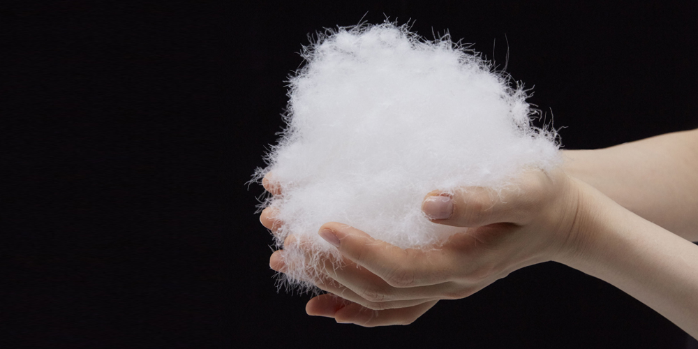 一つひとつのダウンボールが非常に大きくより多くの空気を含むことができるので、驚くほどの軽さを実現しています。また、この良質なダウンボールは、ミクロの世界にまでかぎ状の突起があり、互いにからんだりもつれあうのを防いでいます。