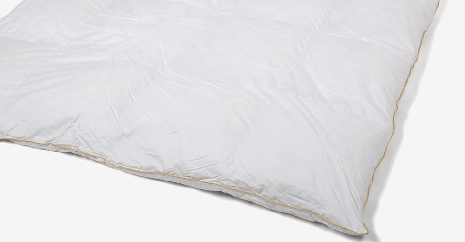 羽毛布団「ダウナ」Nレギュラーはシングルサイズで羽毛充填量960gです。一般的な羽毛布団は1.2kg〜1.5kgの製品が多く、まるで何も掛けていないかのような感覚にきっと驚かれるでしょう。