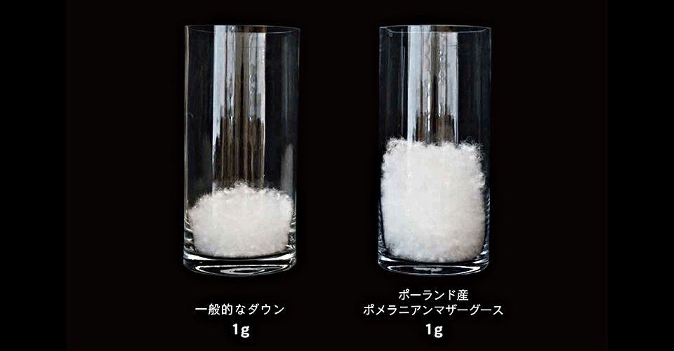 ダウナにはポーランド北部ポメラニア地方で飼育されている「ポメラニアングース」という品種の母鳥(マザーグース)の羽毛が使用されています。ポメラニア地方は昼と夜、そして夏と冬の寒暖差が激しく、一年のうち20日前後は−20℃以下の極寒の日があります。この厳しい自然環境に順応したポメラニアングースは格段に大きく成熟したダウンを持ちます。