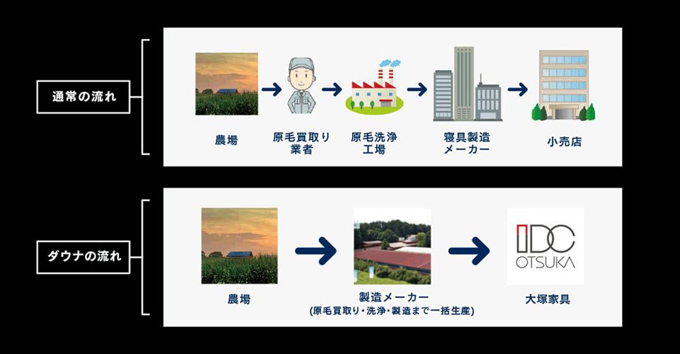 通常、羽毛布団が生産されるまでには様々な業者を経由しますが、ダウナは全て製造メーカーでの一括生産。その製造メーカーから直接仕入れられるからこそリーズナブルな価格を実現しています。