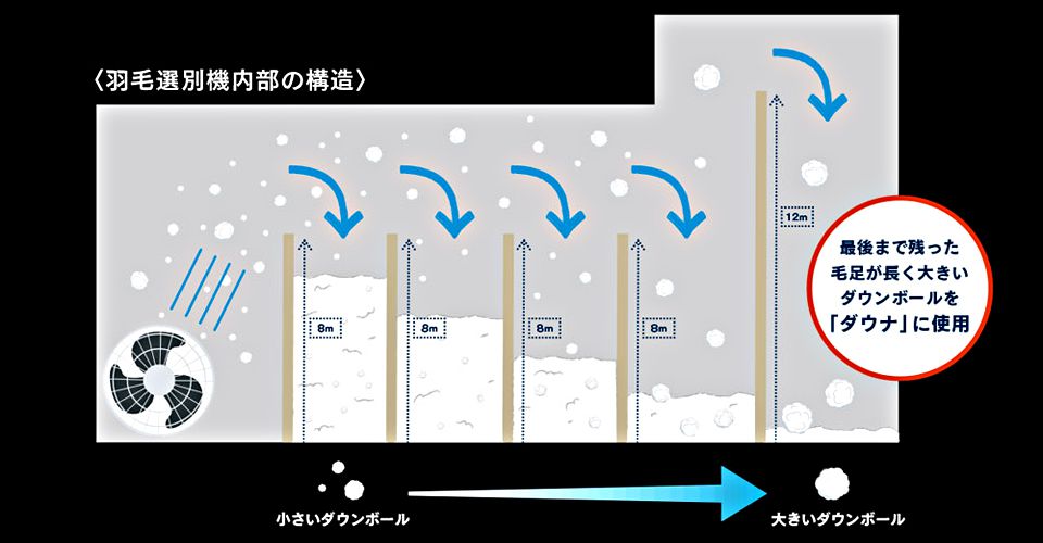 農場より集められた羽毛は、ダウンとフェザーに分けるため高さ8〜12mの選別機にかけられます。選別機はコンピューターによって制御されており、ダウンの混毛率が常に95%程度になるように設定されています。