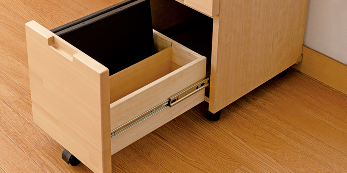 天板にはものを置くスペースがあるので、付属のペントレーを置いたり、タブレットやモバイルの一時的な置き場にも便利です。下段引き出しはA4ファイル対応。フルオープンレールで最後まで引き出せ、出し入れも楽に行えます。