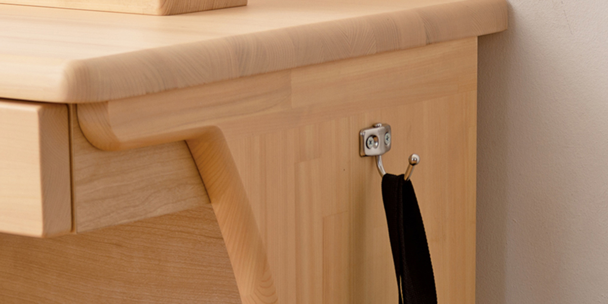 デスクの左右に各1個ずつ、大型のフックが付いています。ランドセルもラクラク整頓できます。