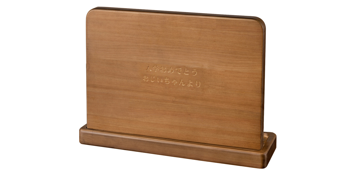 付属のペントレー、タブレットスタンドにお子様のお名前や記念のメッセージを無償で彫刻いたします。世界に一台だけの特別な学習デスクにすることができます。