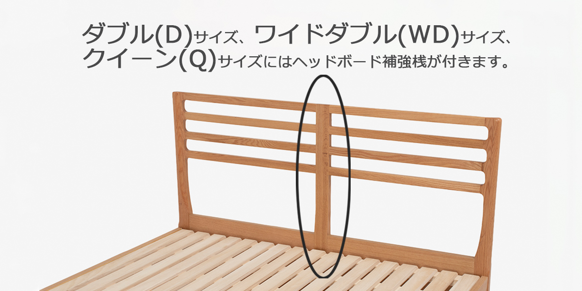 サイズによりデザインが異なります。ダブル(D) サイズ、ワイドダブル(WD)サイズ、クイーン(Q)サイズはヘッドボードの中央に補強桟のあるデザインです。 ※画像は「ベッドフレーム シネマ すのこタイプ」のものです。こちらのページは「ヘッドボードタイプ」のページです。