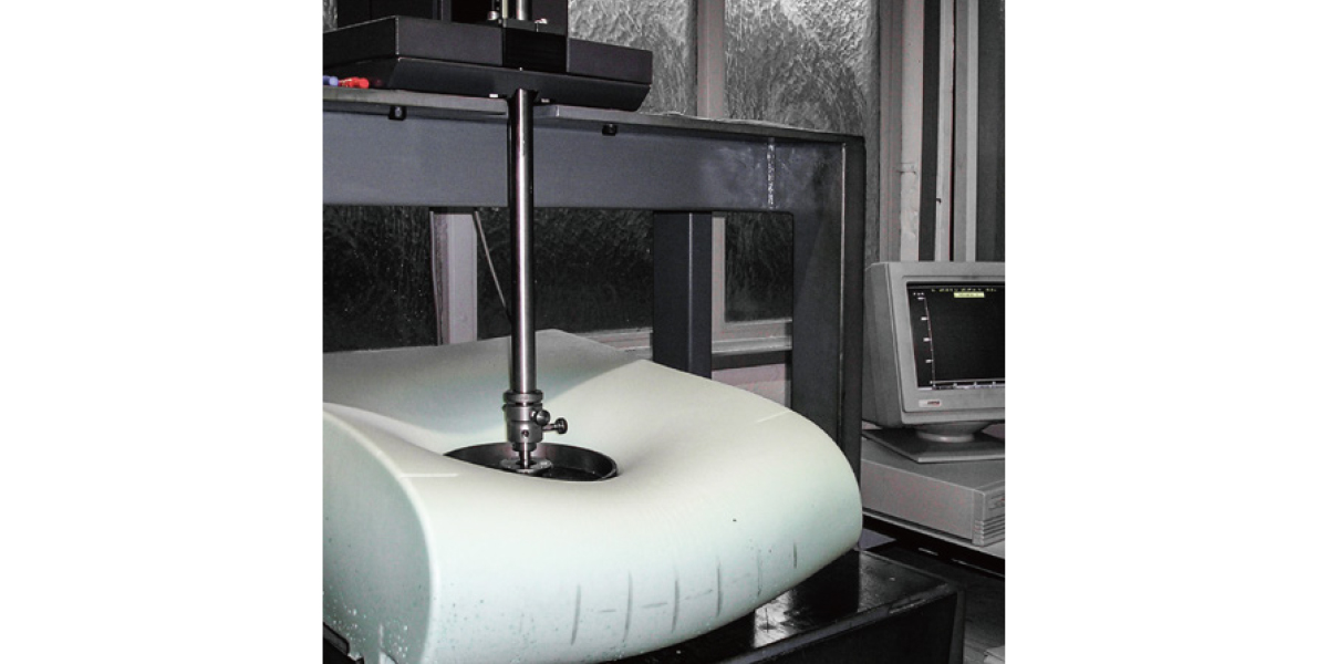 大きなウレタンの塊から切り出す通常のウレタンと違い、座面の形状をした金型に材料(液体)を注入し発泡させて作るモールドウレタン。