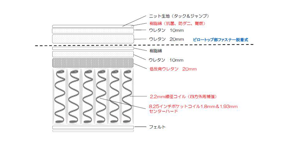 上半身と下半身部分には線経1.8mmのポケットコイルを使用。腰部分には線経1.93mmのポケットコイルを使用。ゾーンごとに硬さを変えたセンターハード仕様で、腰部分をしっかりサポートします。