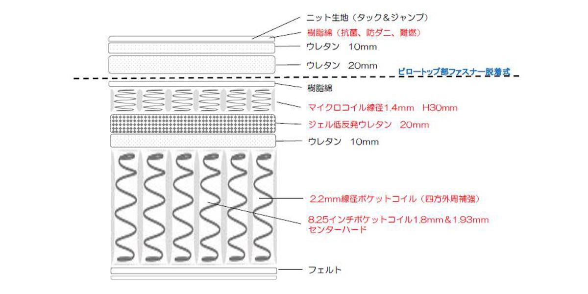 上半身と下半身部分には線経1.8mmのポケットコイルを使用。腰部分には線経1.93mmのポケットコイルを使用。ゾーンごとに硬さを変えたセンターハード仕様で、腰部分をしっかりサポートします。
