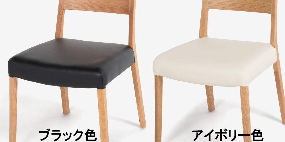 レッドオーク材の無垢材を使用した天然木のあたたかみを感じるカバーリングタイプのダイニングチェアです。座面はPVC素材のブラックとアイボリーの2色から選べ、オプションでPVCの座面の上に布カバーを取り付けることができます。