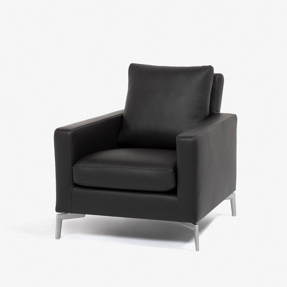 細身のフレームとシルエットで洗練されたイタリアモダンを感じられるソファシリーズ「ベラビスタ」のアームチェアです。本革ならではの質感と上質な風合いをおたのしみいただけます。奥行85cmのコンパクトなサイズ感に加え、背もたれに向かって幅が狭くなる台形型になっており、すっきりとしたデザインです。