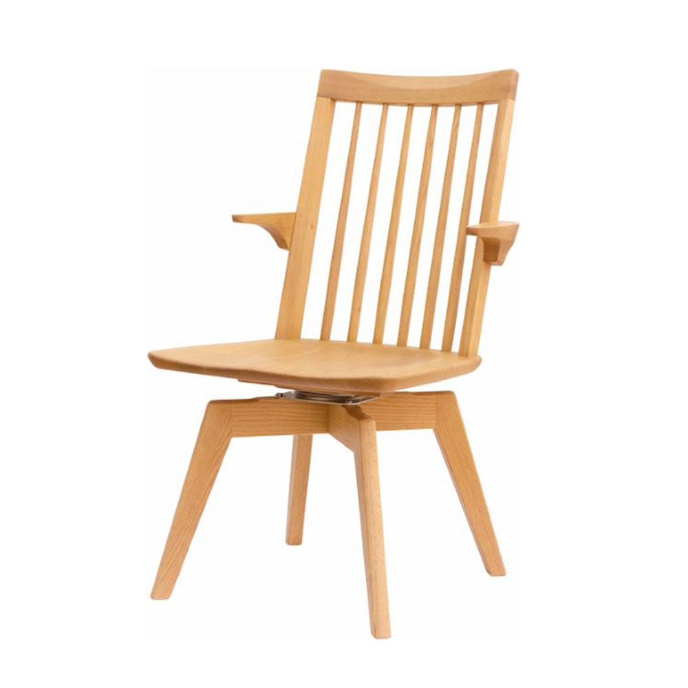 格子の背もたれがすっきりとした印象を与え、インテリアのテイストを選ばず、合わせやすいダイニングチェアです。オーク材を使用しており、天然木のやさしい風合いが感じられます。コンパクトな肘はゆったりと座れるだけでなく、立ち上がる際の支えにもなります。椅子を引かずに立ち上がれる回転椅子です。