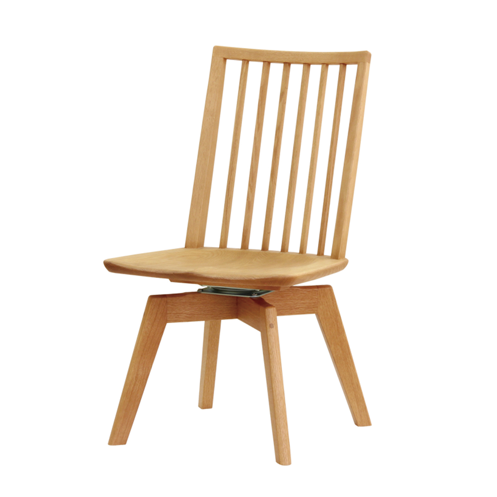格子の背もたれがすっきりとした印象を与え、インテリアのテイストを選ばず、合わせやすいダイニングチェアです。オーク材を使用しており、天然木のやさしい風合いが感じられます。椅子を引かずに立ち上がれる回転椅子です。