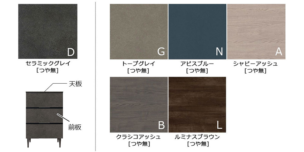 天板・前板:セラミックグレイ/トープグレイ/アビスブルー/シャビーアッシュ/クラシコアッシュ/ルミナスブラウン