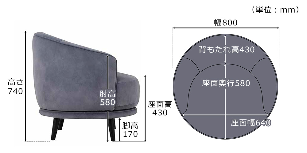 曲線を活かした丸みのあるフォルムが魅力的なアームチェアです。約270度の回転機能付きで身体の向きが変えやすく、快適にくつろげるデザインになっています。