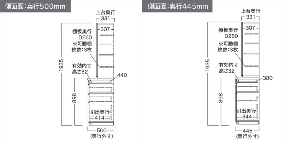 【奥行445mm】引出し(奥行外寸+335mm)、スライドテーブル(奥行外寸+337mm)
