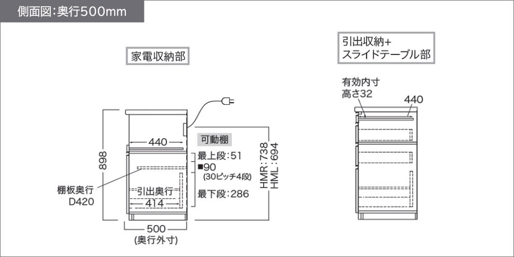 ※スライド時奥行寸法:引出し(奥行外寸+405mm)、スライドテーブル(奥行外寸+435mm)