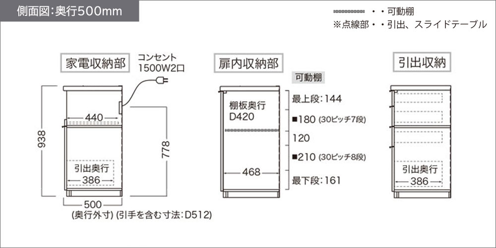 | 奥行500(深引出し部) | 2個 | 2個 | ー | ー |