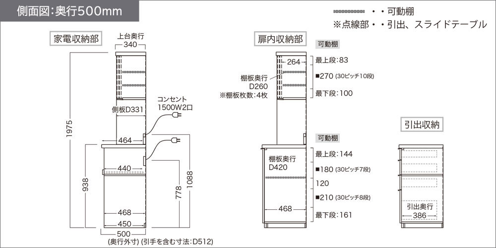 | 奥行500(オープン部) | 2個※ | 2個※ | 2個 | 2個※ |