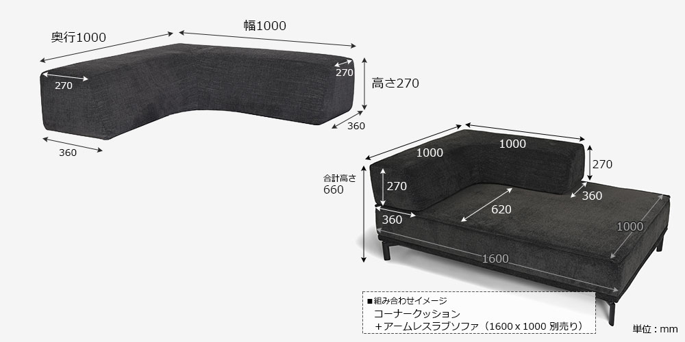 ※画像は「アームレスソファ+アームレスラブソファ+コーナークッション+背クッション2個+肘クッション」の合計6点を使用したイメージです。コーナークッション以外は別売りです。