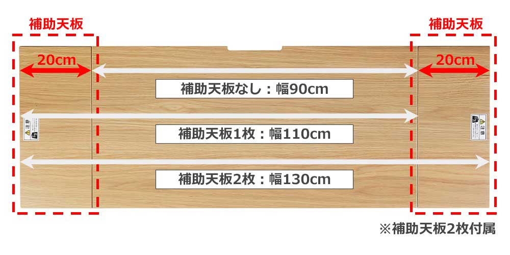 付属の2枚の補助天板の付替えで、デスク幅を90cm・110cm・130cmの3段階に調整することが可能です。