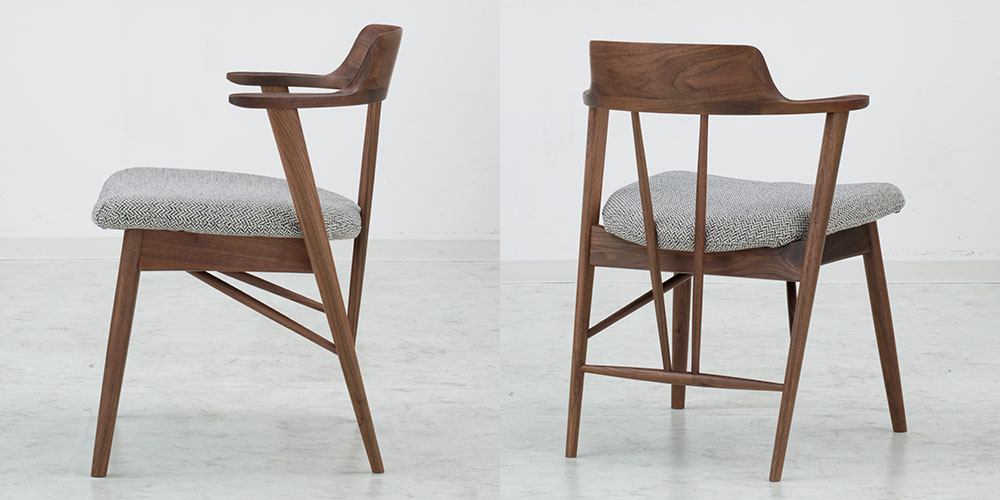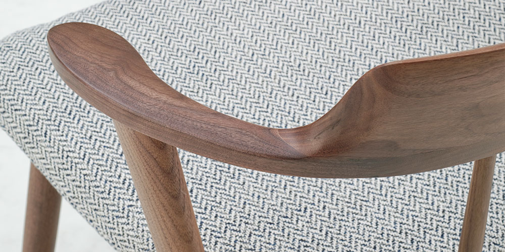 背当たり部(笠木部)は曲木技術で無垢を曲げ、背にぴったり合うように削り出しています。なめらかな曲線で仕上げた短めのひじ掛けは、自然な角度で腕をあずけて心地良くくつろぐことができます。