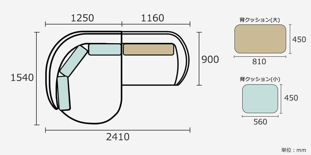 本ページは「片肘カウチ 向かって左肘(CLT-S)背クッション小3個付き」+「片肘ラブソファ 向かって右肘(1.5ER)背クッション大1個付き」を組み合わせたカウチソファです。