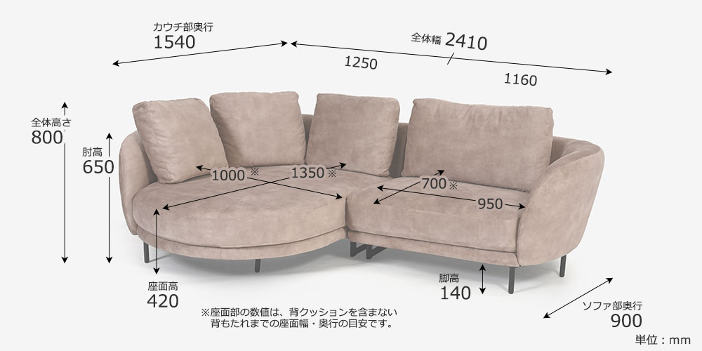 | ・片肘カウチ 向かって左肘(CLT-S) | 幅1250x奥行1540x高さ800 |