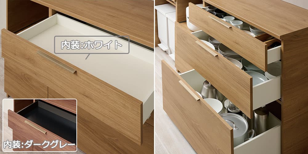 深さの異なる3杯の引出しは用途に合わせて収納できます。引出し内装はラスティックオーク色・シルキーナット色はホワイト、グレイッシュナット色・ウォールナット色はダークグレーです。