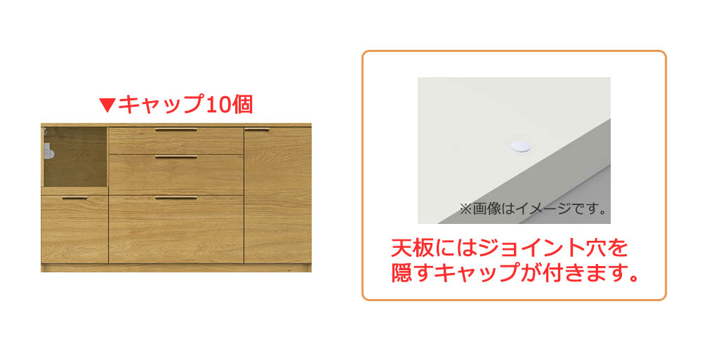 オープンボードの下台のみをカウンターとしてお使いいただく仕様です。そのため、天板には上台とのジョイント穴を隠す樹脂製のキャップが10箇所付きます。シルキーナット色にはホワイト、ラスティックオーク色にはベージュ、グレイッシュナット色・ウォールナット色にはブラックのキャップが付属します。