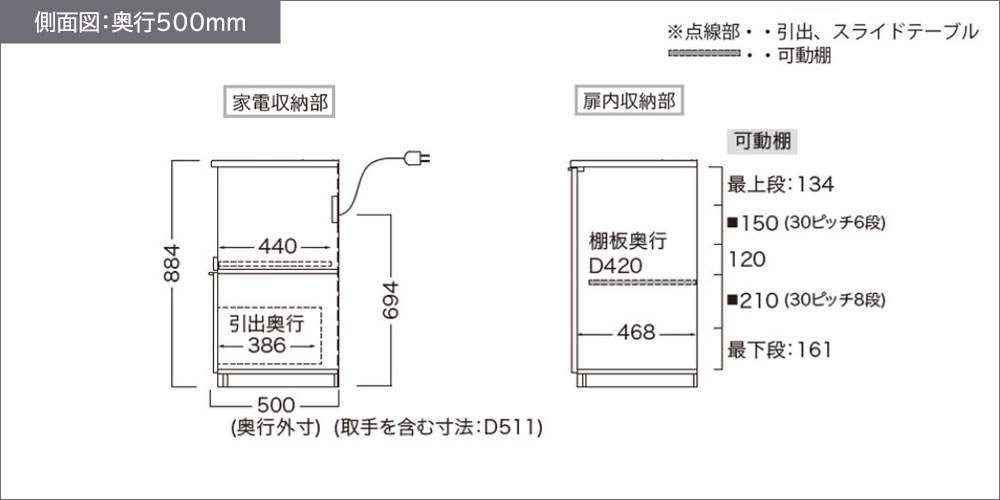 スライドテーブル式で炊飯器も置くことが出来る家電収納スペース付きです。深さの異なる3杯の引出しは用途に合わせて収納できます。幅160cmには可動棚付きの開き扉もあり、ストックや高さのある物の収納にも対応できます。