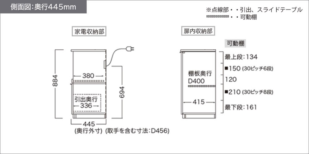 【スライド時奥行寸法】引出し:奥行外寸+363mm(引手含む)、スライドテーブル:奥行外寸+435mm