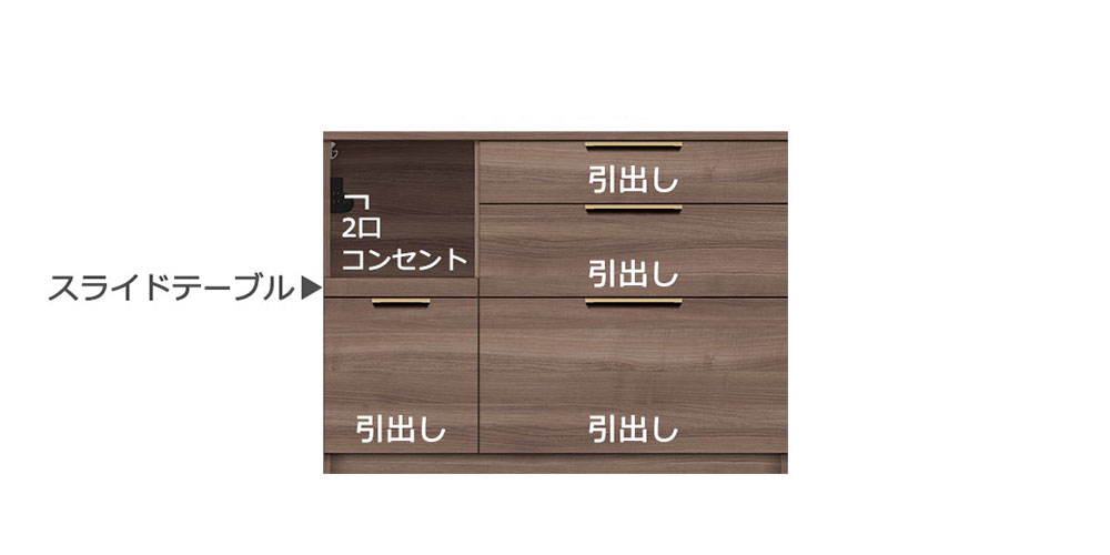 スライドテーブル式で炊飯器も置くことが出来る家電収納スペース付きです。深さの異なる3杯の引出しは用途に合わせて収納できます。