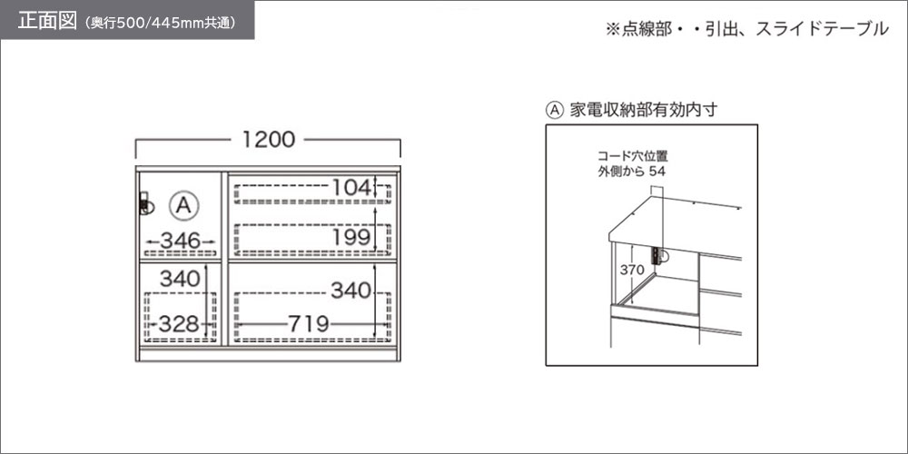 【スライド時奥行寸法】(奥行445mm)引出し:奥行外寸+317mm(引手含む)スライドテーブル:奥行外寸+337mm