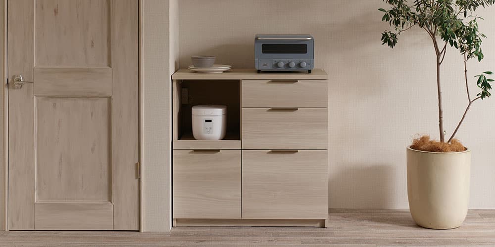 ナチュラルなインテリアに馴染む木目柄で統一されたデザインのNWシリーズのキッチンカウンター。使い勝手の良い引出し収納と家電収納を備えています。