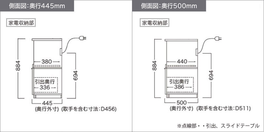 (奥行500mm)引出し:奥行外寸+363mm(引手含む)、スライドテーブル:奥行外寸+435mm