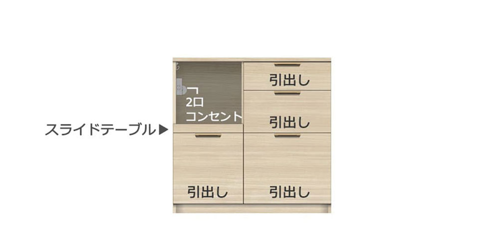 スライドテーブル式で炊飯器も置くことが出来る家電収納スペース付きです。深さの異なる3杯の引出しは用途に合わせて収納できます。