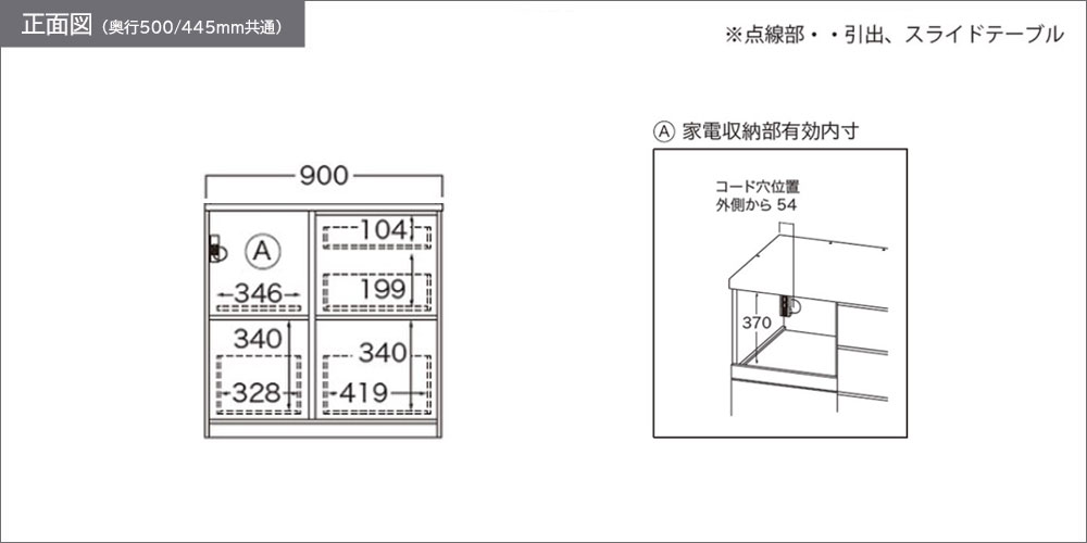 【スライド時奥行寸法】(奥行445mm)引出し:奥行外寸+317mm(引手含む)スライドテーブル:奥行外寸+337mm
