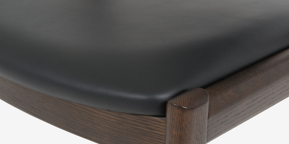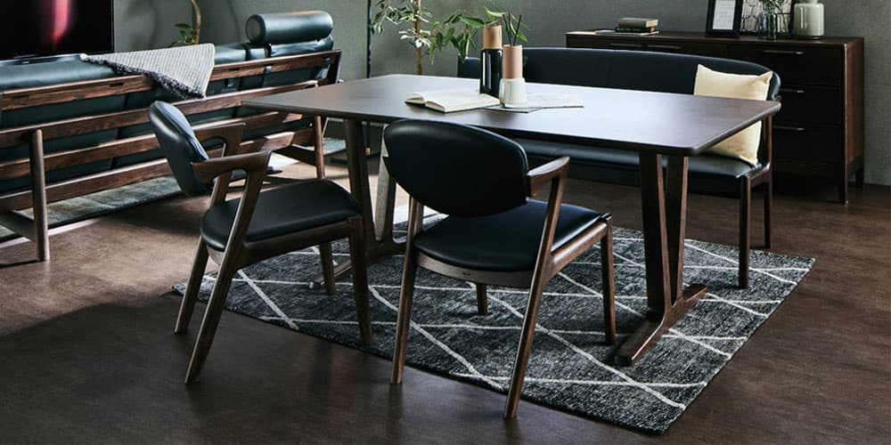 浜本工芸のオーク材(カフェ色)とブラック系で統一したコーディネート。丸みのあるフォルムのなかにアームの角度がアクセントになっています。