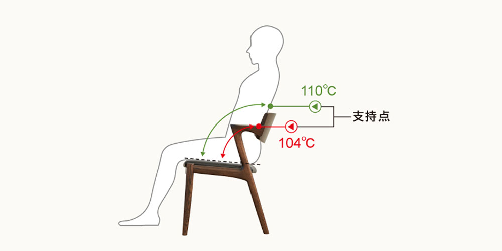 人間工学に基づく2つの支持点の組み合わせは、ダイニングチェアに最も適しているとされる角度です。背の高さと角度、横の曲線の組み合わせによって、腰当たりの良い座り心地となっています。