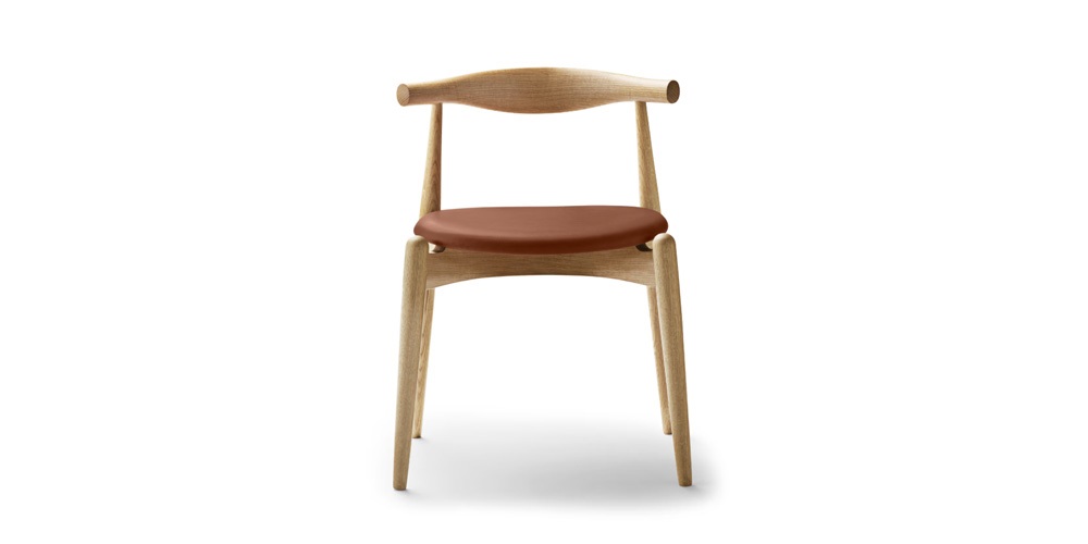 エルボーチェアの大きな特徴は印象的な曲木製の背もたれ。一枚の無垢材から製作され、背を支えると同時に、アームレストとしても機能する形状になっています。これにより、様々な座り方ができる椅子となっています。座のフォルムは曲線を描く背の形状を反映したもの。脚の上部にまるで浮いて見えるようにデザインされています。