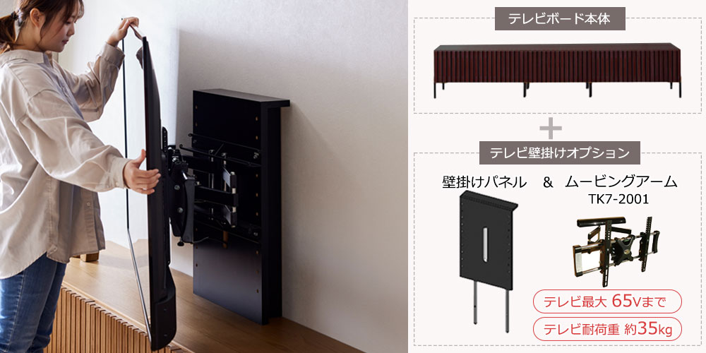 テレビ壁掛けオプション(壁掛けパネル+ムービングアーム)を取り付けることで、工事をすることなく壁掛け仕様にできます。
