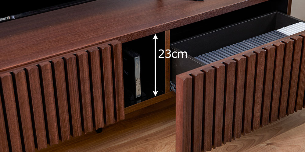 モデム・ルーターなどが仕舞える約23cmの縦収納スペースを設けています。コンセントタップの配線溜まりとしてもお使いいただけます。※画像は220テレビボードイメージです。