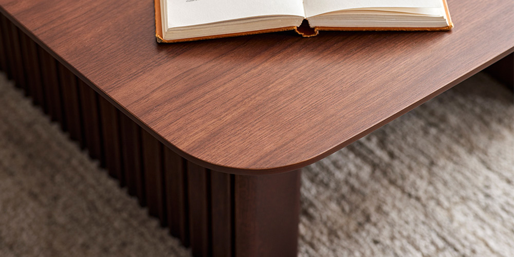 天板と本体にウォールナット材突板、脚部側面の格子にはオーク無垢材(ウォールナット色に着色)を贅沢に使用しています。職人が1本1本、えぐり面形の磨きをかけることで陰影が強調され、自然光/照明の当たり方によっても表情を変えます。※天然木の為、木目や色味は一点ごとに異なります。※画像は「80センターテーブル」のイメージです。