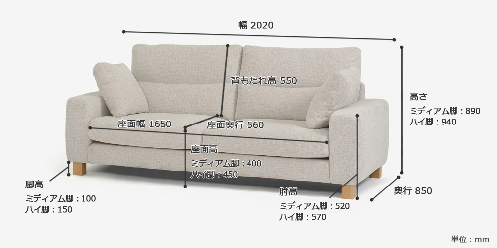 | ミディアム脚 | 幅2020x奥行850x高さ890 座面高400 |