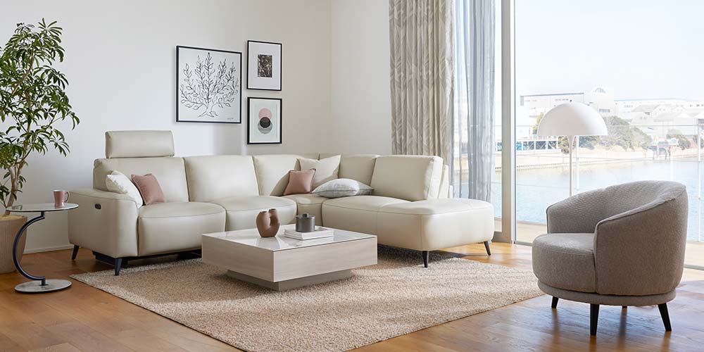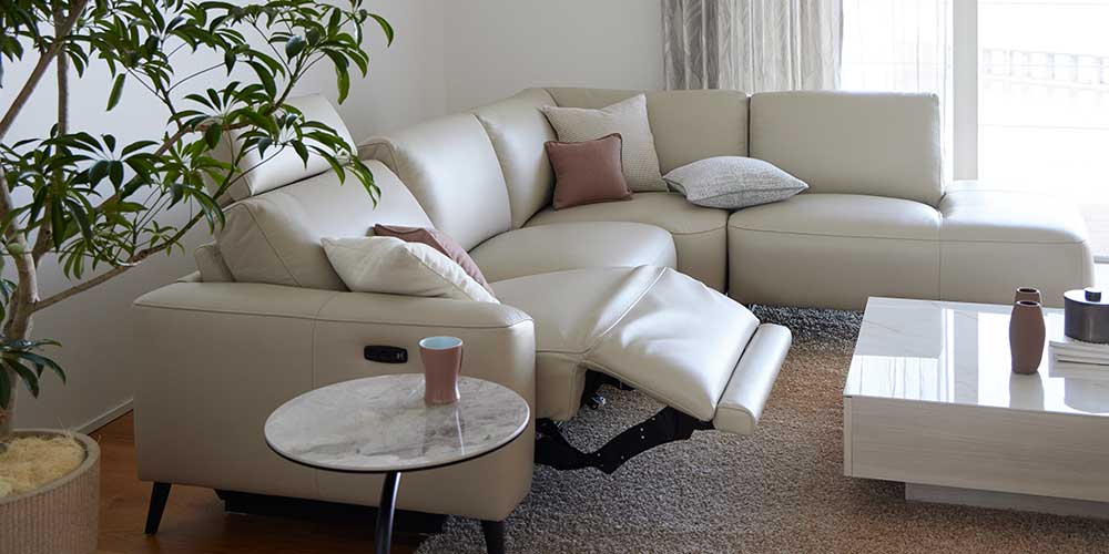 洗練されたデザインに快適なリクライニング機能を兼ね備えた、電動リクライニングコーナーソファ。座面や背もたれには継ぎ目のない一枚革を贅沢に使用し、シンプルながらも優雅さを感じるデザインが魅力的です。