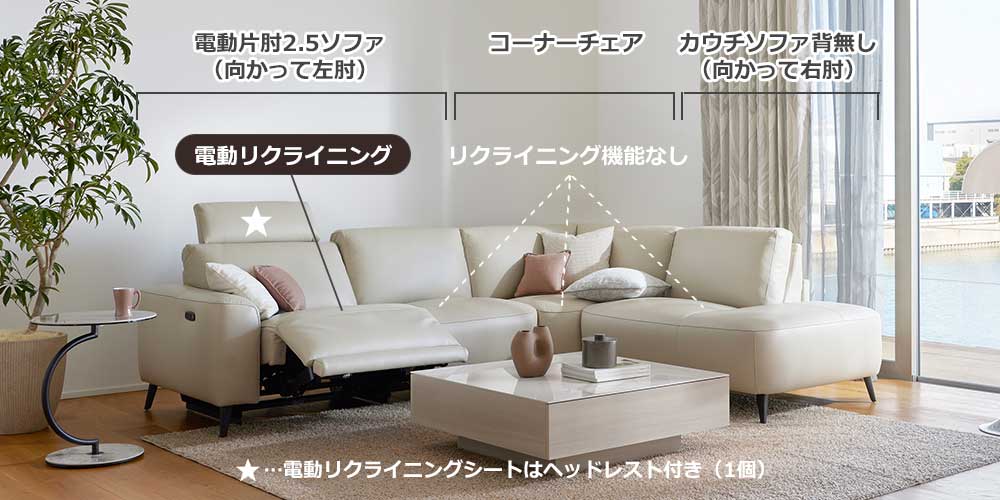 向かって一番左側のシートに、背面と座面が同時に動く1モータータイプの電動リクライニング機能がついています。リクライニング機能付きのシートにはヘッドレストが付いており、頭から足までゆったりと身体を預けてくつろぐことができます。コーナーチェアに座り、カウチ部分に脚をのせてくつろぐことも可能な組合わせです。