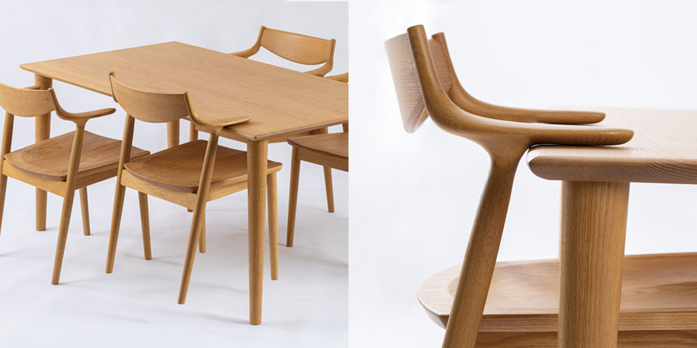 曲木加工を施した背板、複雑な曲面の形成からなる有機的な肘形状など、浜本工芸の職人の高い技術を活かしたクラフトマンシップを感じるダイニングシリーズです。背は一枚板に曲木加工を施しており、背当たりのよい曲線が魅力です。座面の凹凸がフィットし、快適な座り心地の板座タイプです。