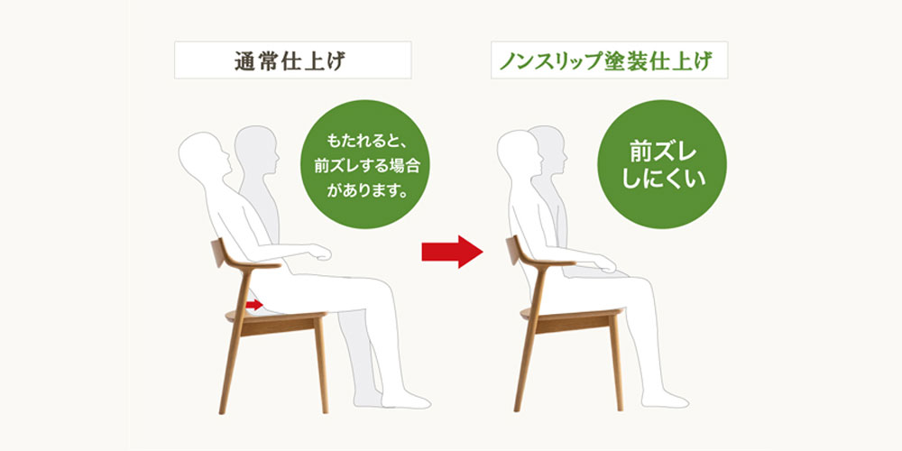 身体をもたれても滑りにくいので、姿勢が崩れにくく、安定した座り心地が得られます。※ノンスリップ塗装の滑り止め効果は、ご使用頻度や環境により徐々に弱まります。